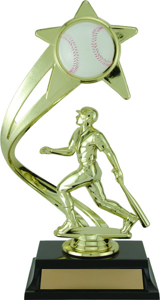 Shooting star with baseball insert and baseball player on top of black base.